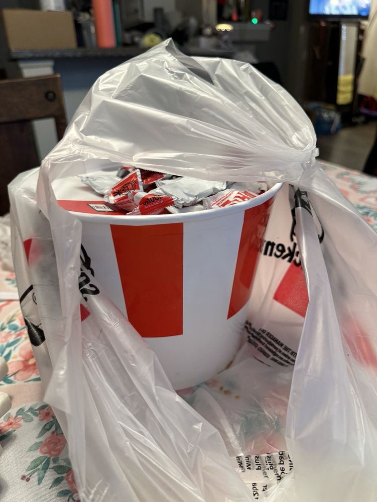 10 pieces of our freshly prepared chicken, available in Original Recipe or Extra Crispy, 2 large mashed potatoes, a gravy, a large cole slaw, 4 biscuits, a beverage bucket, and 4 cookies.